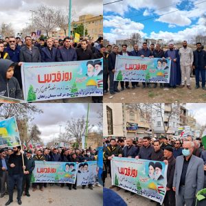 مراسم با شکوه راهپیمایی روز جهانی قدس و اعلام برائت از استکبارگران با حضور گسترده گروههای مختلف مردم و پرسنل بسیجی سیمان زنجان در شهرستان خدابنده استان زنجان برگزار شد.